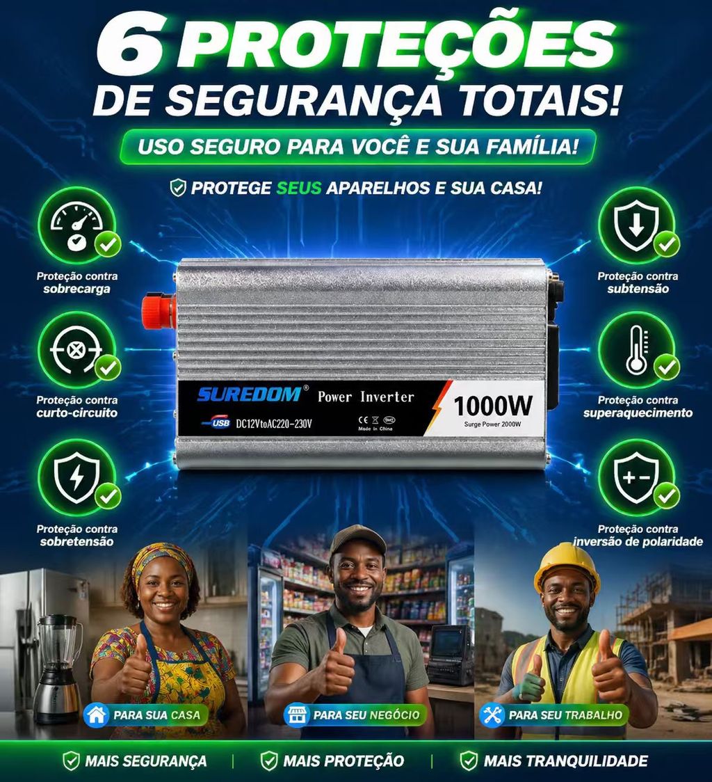 - Potência Insana: 1000W nominal = desempenho superior a inversores 3000W convencionais, não desliga nem com carga total